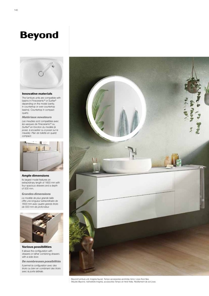 Meuble Beyond, robinetterie Insignia, accessoires Tempo et miroir Iridia. Revêtement de sol Liceo.