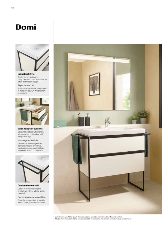 Meuble Domi, robinetterie Malva, accessoires Rubik et miroir Eidos. Revêtement et revêtement de sol Downtown.