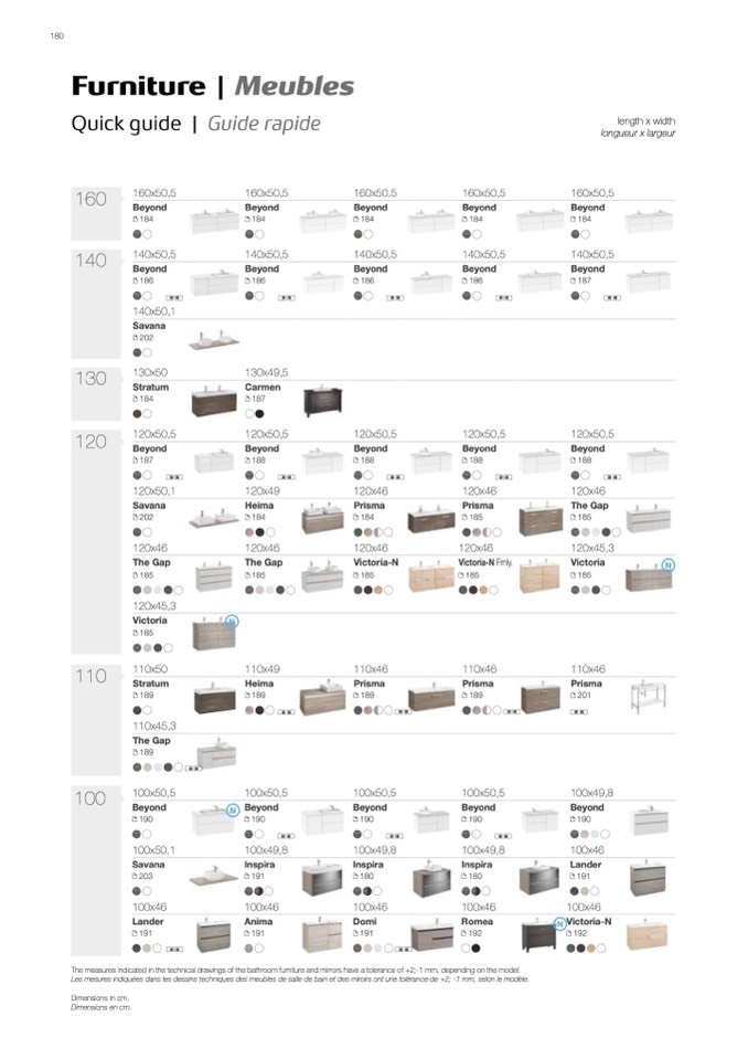 Les mesures indiquées dans les dessins techniques des meubles de salle de bain et des miroirs ont une tolérance de +2; -1 mm, selon le modèle.