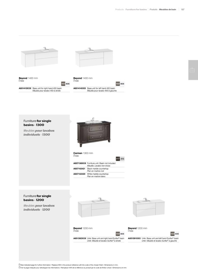 Voir la page indiquée pour développer les informations / Remplacer XXX de la référence du produit par le code de finition choisi / Dimensions en mm.