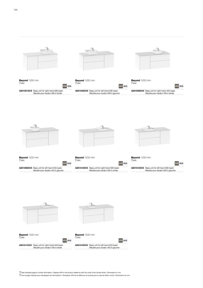 Voir la page indiquée pour développer les informations / Remplacer XXX de la référence du produit par le code de finition choisi / Dimensions en mm.