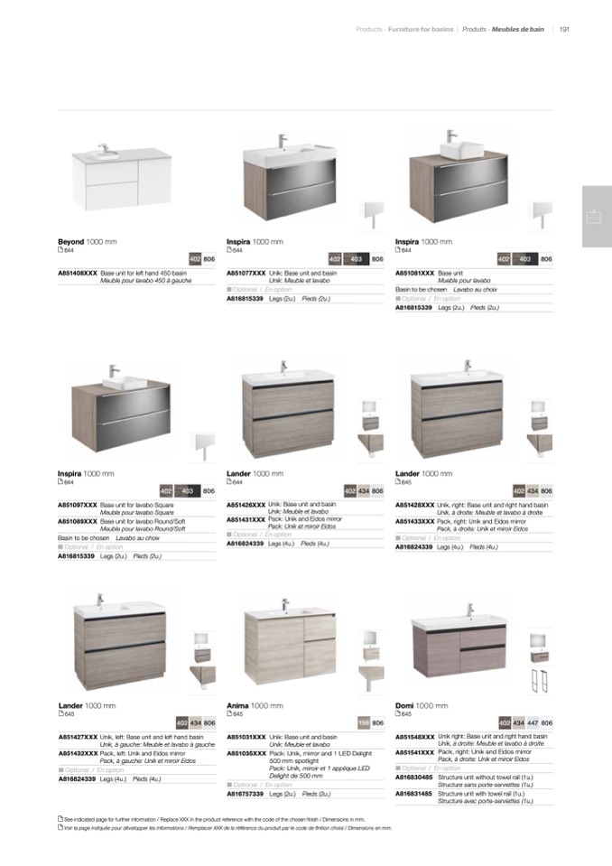 Voir la page indiquée pour développer les informations / Remplacer XXX de la référence du produit par le code de finition choisi / Dimensions en mm.