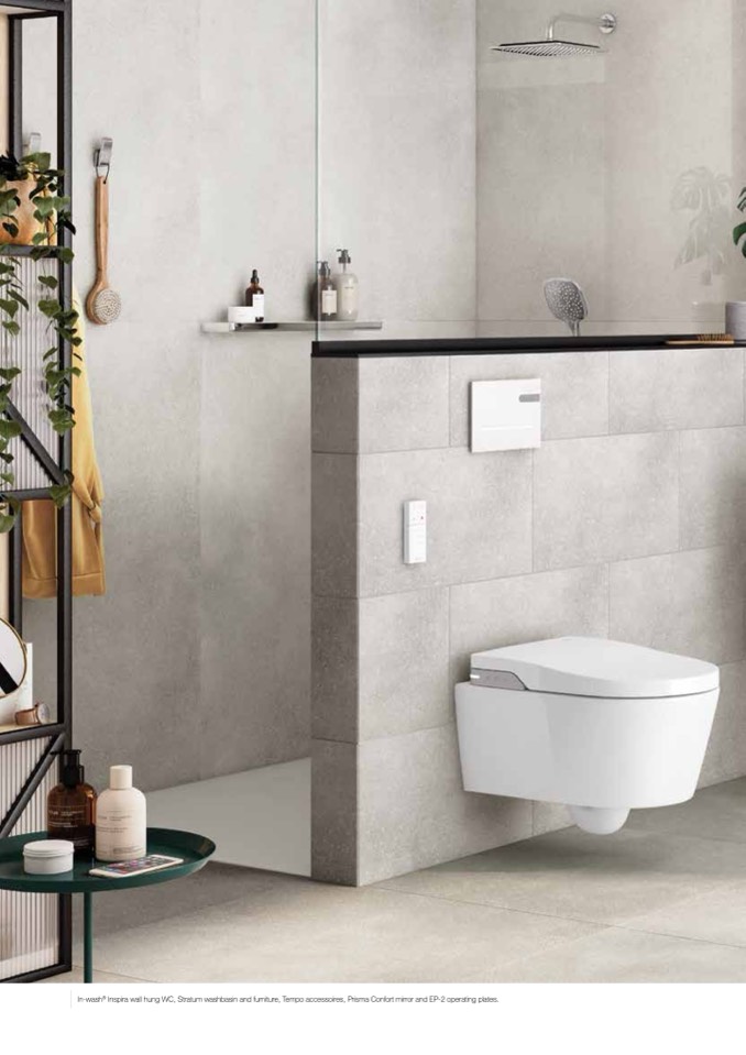 Inspira wall hung WC, Stratum washbasin and furniture, Tempo accessoires, Prisma Confort mirror and EP-2 operating plates.
