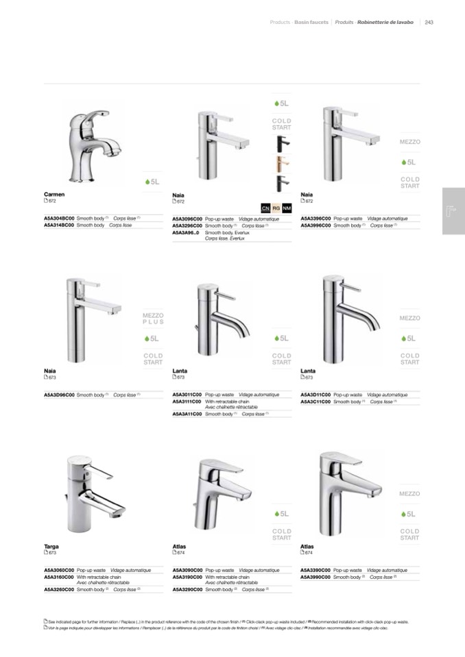 Voir la page indiquée pour développer les informations / Remplacer (..) de la référence du produit par le code de finition choisi / (1) Avec vidage clic-clac / (2) Installation recommandée avec vidage clic-clac.