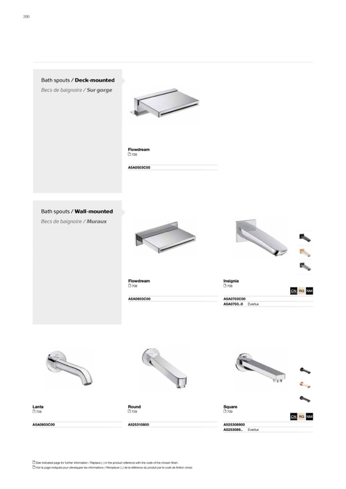 See indicated page for further information / Replace (..) in the product reference with the code of the chosen finish.