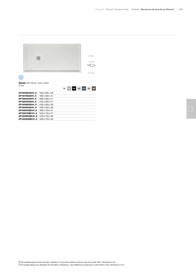 Voir la page indiquée pour développer les informations / Remplacer (..) de la référence du produit par le code de finition choisi / Dimensions en mm.
