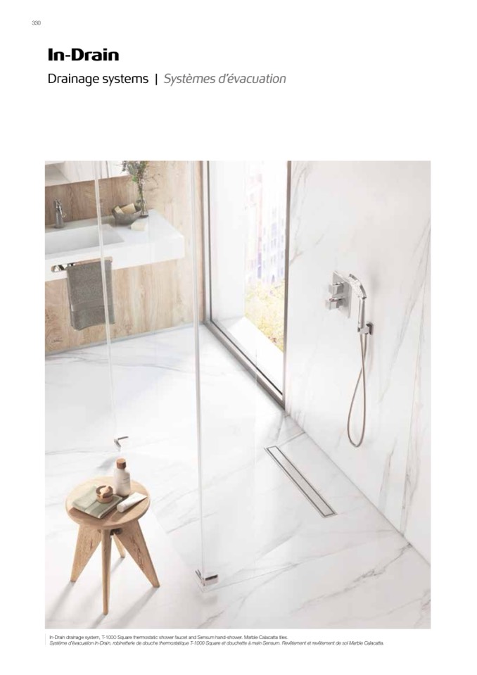 In-Drain drainage system, T-1000 Square thermostatic shower faucet and Sensum hand-shower. Marble Calacatta tiles.