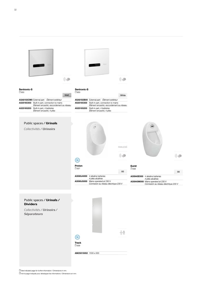 Voir la page indiquée pour développer les informations / Dimensions en mm.
