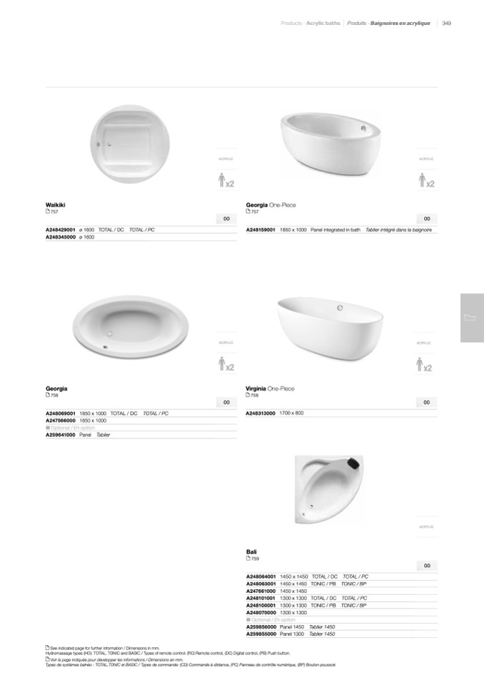 Hydromassage types (HD): TOTAL, TONIC and BASIC / Types of remote control: (RC) Remote control, (DC) Digital control, (PB) Push button.