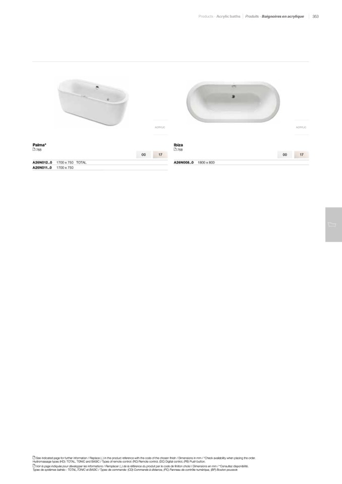 Hydromassage types (HD): TOTAL, TONIC and BASIC / Types of remote control: (RC) Remote control, (DC) Digital control, (PB) Push button.