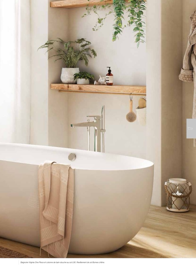 Baignoire Virginia One Piece et colonne de bain-douche au sol L90. Revêtement de sol Borneo chêne.