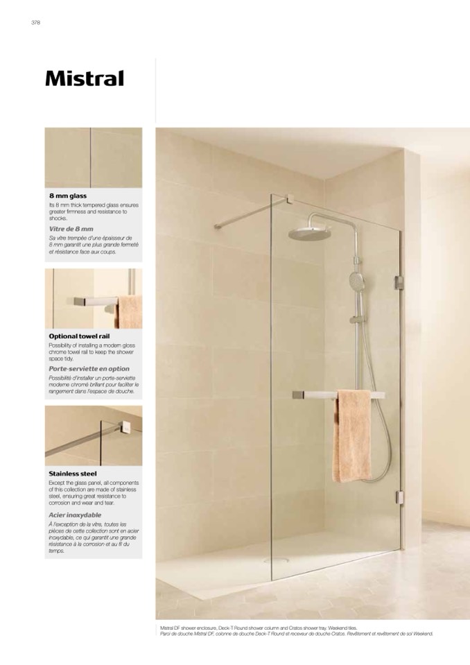 Paroi de douche Mistral DF, colonne de douche Deck-T Round et receveur de douche Cratos. Revêtement et revêtement de sol Weekend.