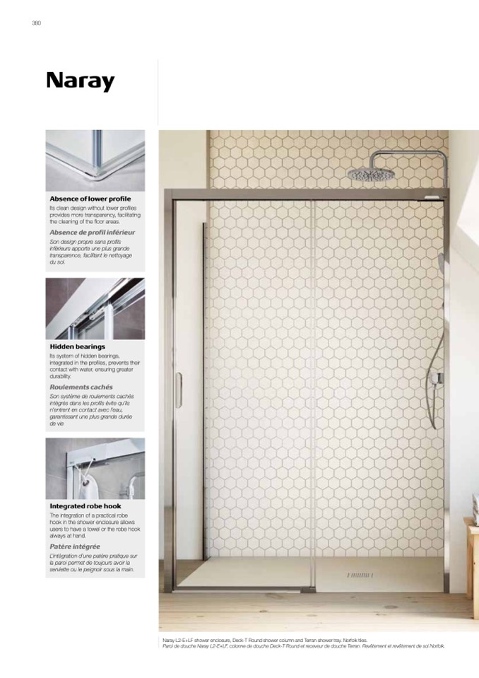 Paroi de douche Naray L2-E+LF, colonne de douche Deck-T Round et receveur de douche Terran. Revêtement et revêtement de sol Norfolk.
