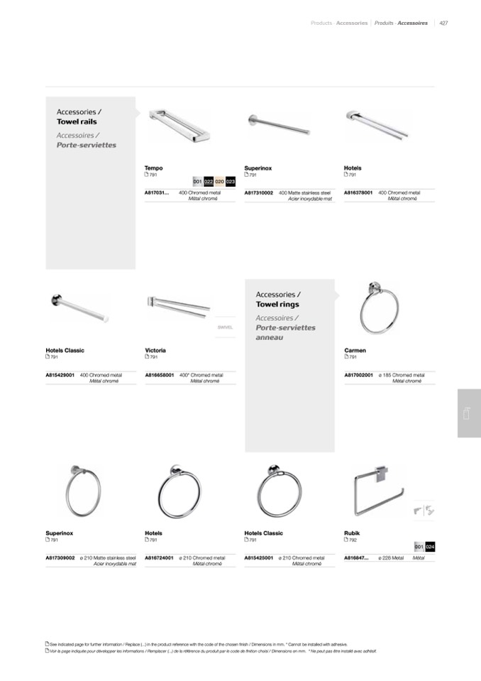 Voir la page indiquée pour développer les informations / Remplacer (...) de la référence du produit par le code de finition choisi / Dimensions en mm. * Ne peut pas être installé avec adhésif.
