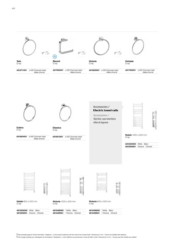 Voir la page indiquée pour développer les informations / Remplacer (...) de la référence du produit par le code de finition choisi / Dimensions en mm. * Ne peut pas être installé avec adhésif.