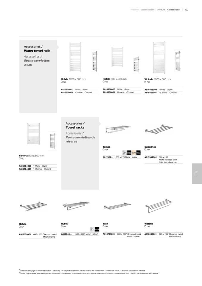 Voir la page indiquée pour développer les informations / Remplacer (...) de la référence du produit par le code de finition choisi / Dimensions en mm. * Ne peut pas être installé avec adhésif.