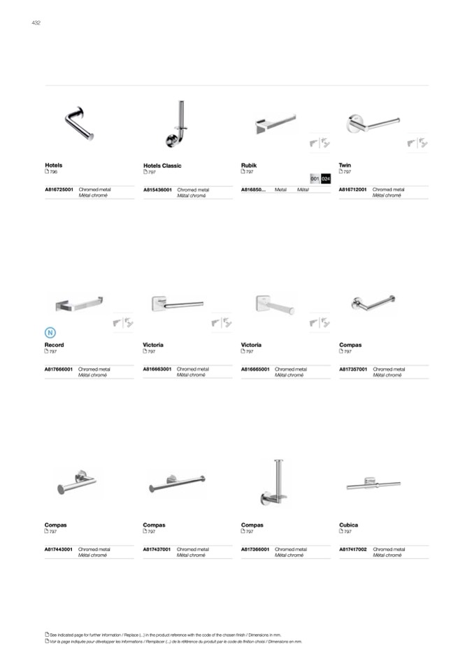 Voir la page indiquée pour développer les informations / Remplacer (...) de la référence du produit par le code de finition choisi / Dimensions en mm.