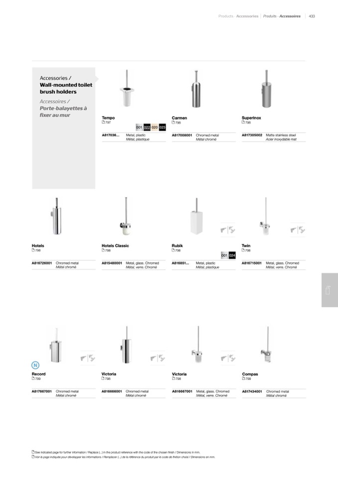 Voir la page indiquée pour développer les informations / Remplacer (...) de la référence du produit par le code de finition choisi / Dimensions en mm.