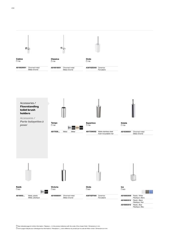 Voir la page indiquée pour développer les informations / Remplacer (...) de la référence du produit par le code de finition choisi / Dimensions en mm.