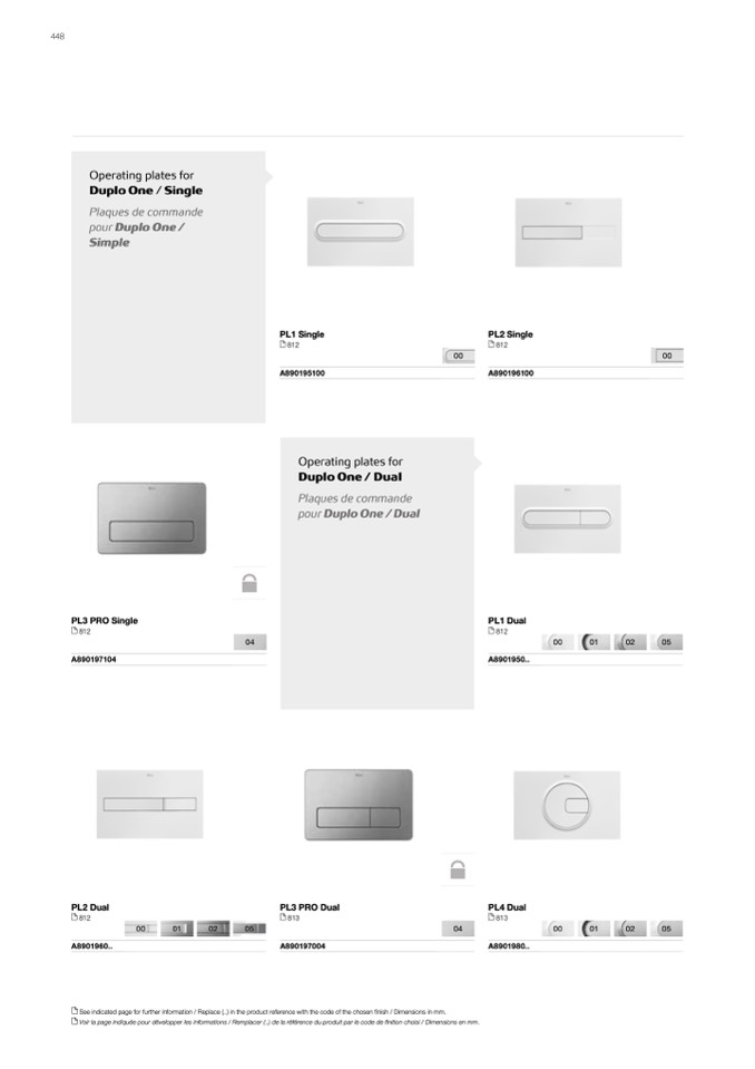 Voir la page indiquée pour développer les informations / Remplacer (..) de la référence du produit par le code de finition choisi / Dimensions en mm.