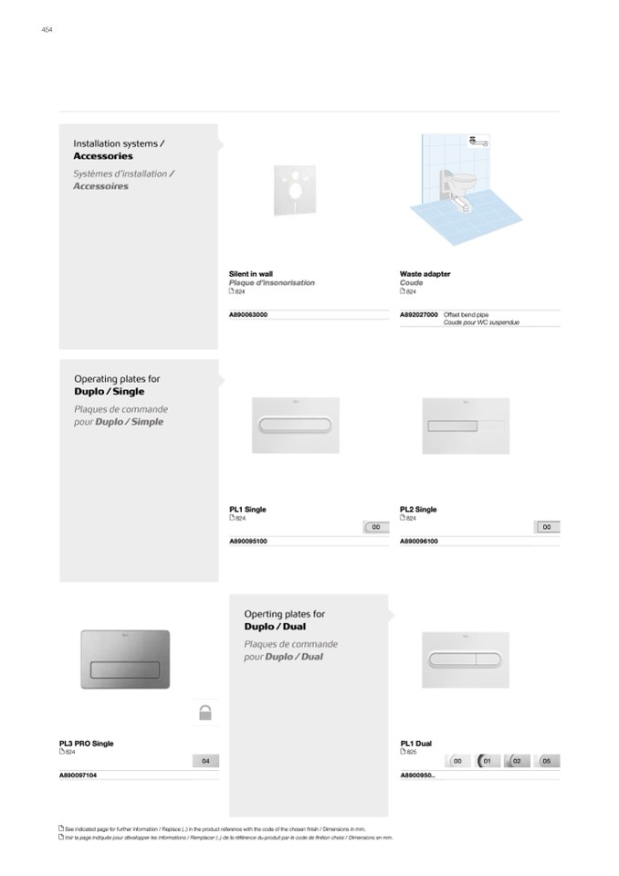 Voir la page indiquée pour développer les informations / Remplacer (..) de la référence du produit par le code de finition choisi / Dimensions en mm.