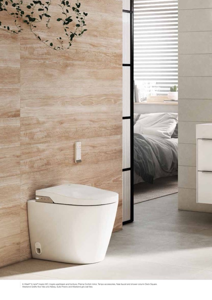 Inspira WC, Inspira washbasin and furniture, Prisma Confort mirror, Tempo accessories, Naia faucet and shower column Deck Square.