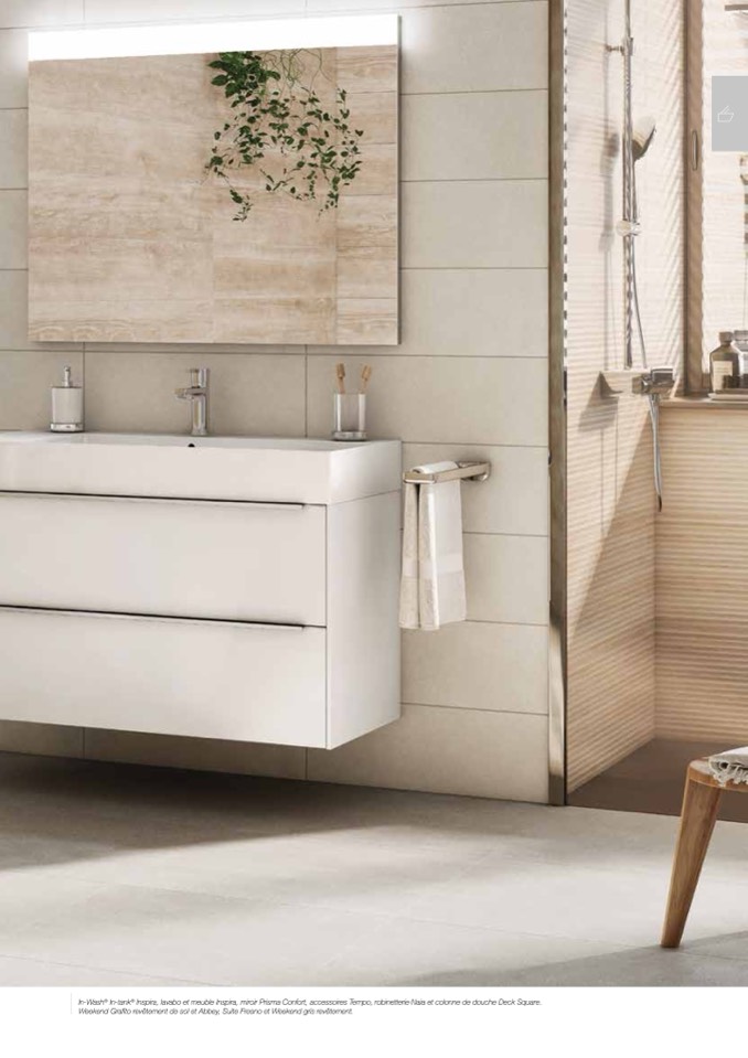 Inspira, lavabo et meuble Inspira, miroir Prisma Confort, accessoires Tempo, robinetterie Naia et colonne de douche Deck Square.
