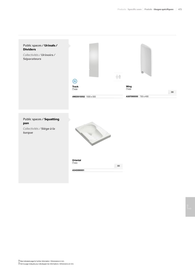 Voir la page indiquée pour développer les informations / Dimensions en mm.