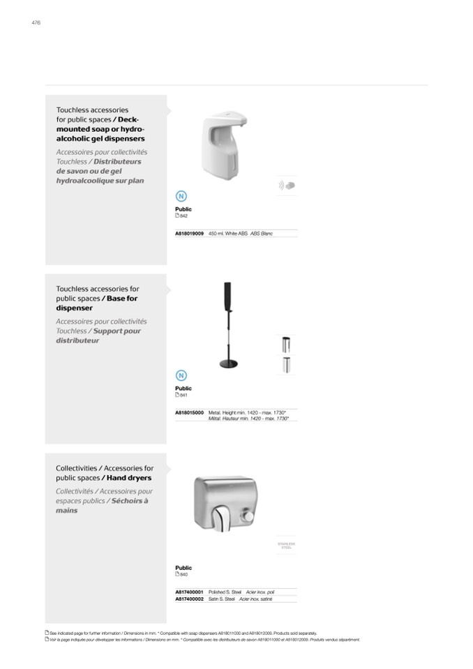 Voir la page indiquée pour développer les informations / Dimensions en mm. * Compatible avec les distributeurs de savon A818011000 et A818012009. Produits vendus séparément.
