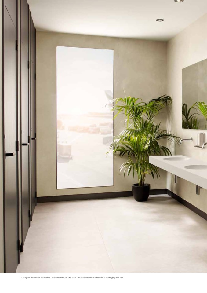 Configurable basin Modo Round, Loft-E electronic faucet, Luna mirrors and Public accessories. Couvet grey floor tiles