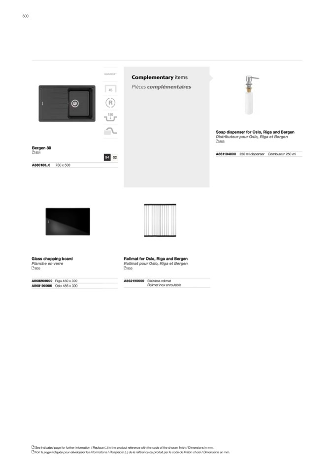 Voir la page indiquée pour développer les informations / Remplacer (..) de la référence du produit par le code de finition choisi / Dimensions en mm.