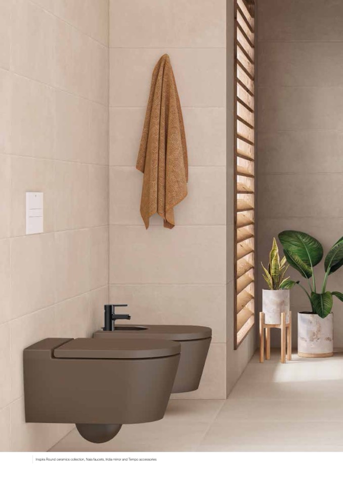 Inspira Round ceramics collection, Naia faucets, Iridia mirror and Tempo accessories