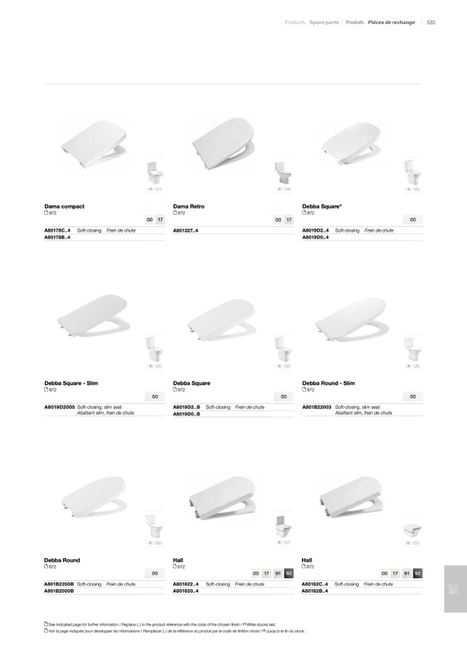 Voir la page indiquée pour développer les informations / Remplacer (..) de la référence du produit par le code de finition choisi / (*) Jusqu'à la fin du stock.