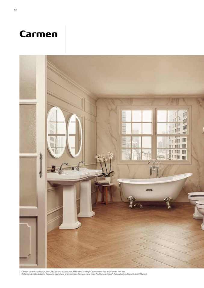 Collection de salle de bains, baignoire, robinetterie et accessoires Carmen, miroir Iridia. Revêtement thinbig