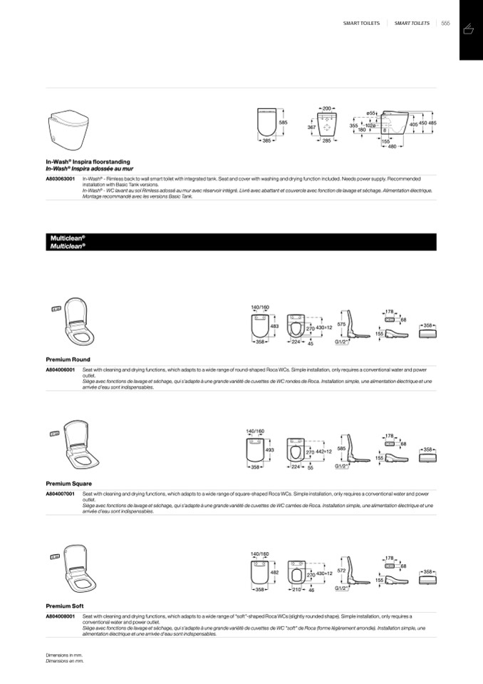 Seat with cleaning and drying functions, which adapts to a wide range of “soft”-shaped Roca WCs (slightly rounded shape). Simple installation, only requires a