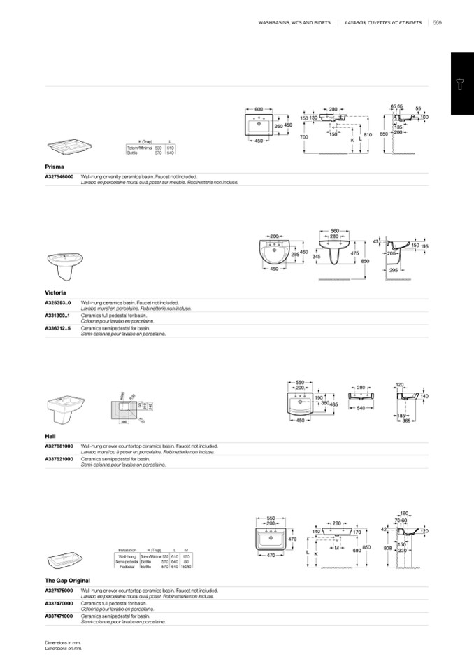 Wall-hung or vanity ceramics basin. Faucet not included.
