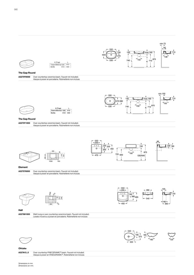 Wall-hung or over countertop ceramics basin. Faucet not included.