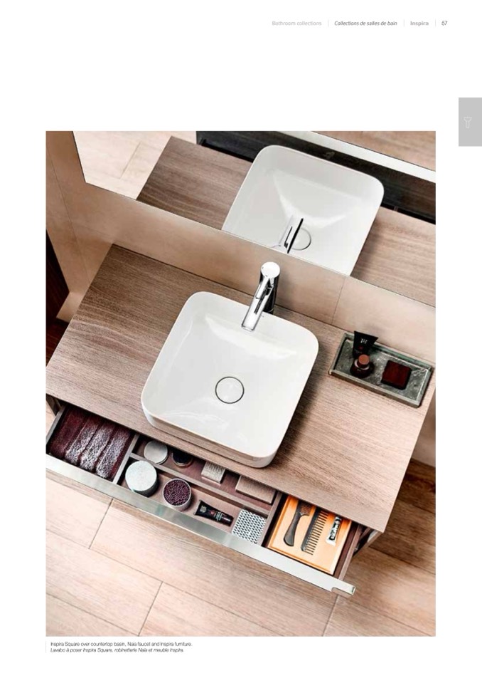 Inspira Square over countertop basin, Naia faucet and Inspira furniture.