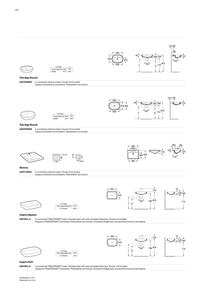 à encastrer. Robinetterie non incluse. Comprend vidage avec couvercle fixe ouvert en porcelaine.