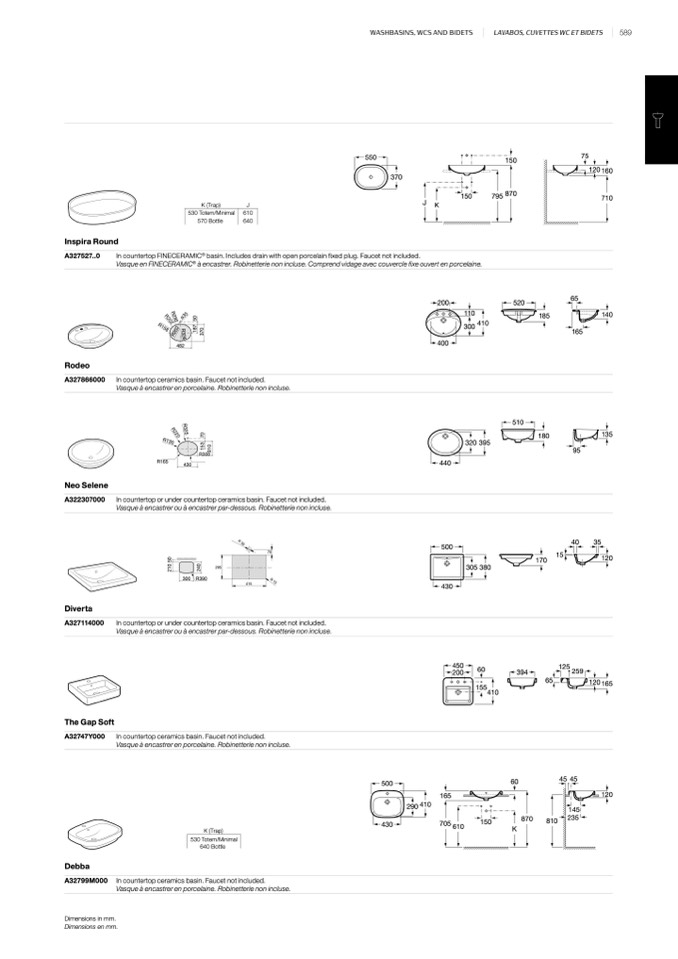 Vasque à encastrer ou à encastrer par-dessous. Robinetterie non incluse.