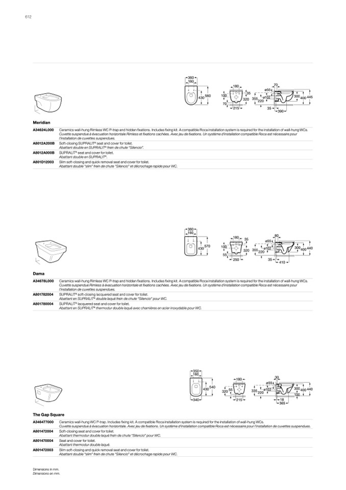 Cuvette suspendue à évacuation horizontale. Avec jeu de fixations. Un système d’installation compatible Roca est nécessaire pour l’installation de cuvettes suspendues.