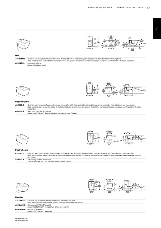 Bidet suspendu sans abattant. Robinetterie non incluse. Un système d’installation compatible Roca est nécessaire pour l’installation de bidets suspendus.