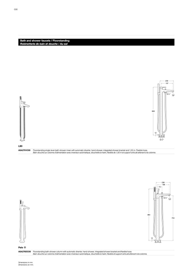 Floorstanding single-lever bath-shower mixer with automatic diverter, hand-shower, integrated shower bracket and 1,50 m. Flexible hose.