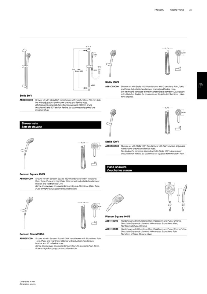 Rain, Tonic, Pulse and NightRain. Slide bar with adjustable handshower