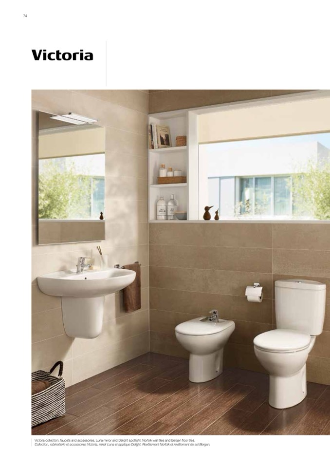 Victoria collection, faucets and accessories, Luna mirror and Delight spotlight. Norfolk wall tiles and Bergen floor tiles.
