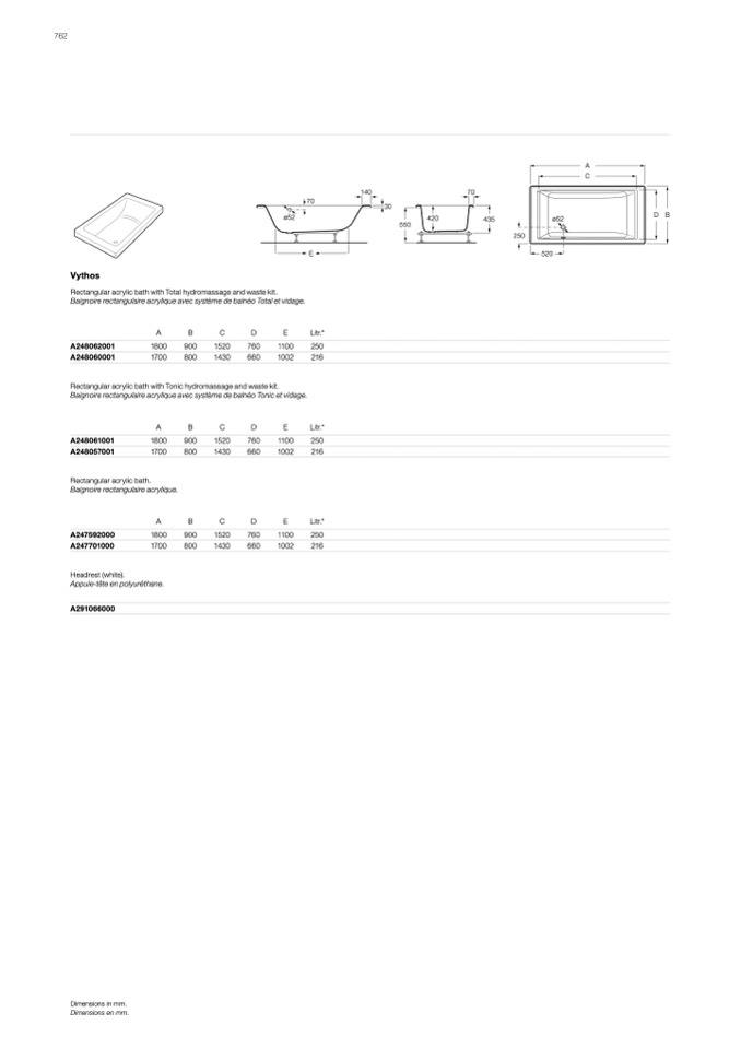 Rectangular acrylic bath with Tonic hydromassage and waste kit.