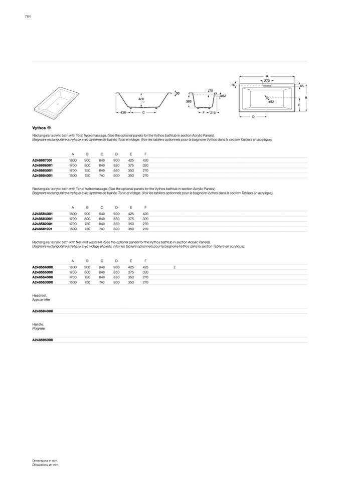 Rectangular acrylic bath with feet and waste kit. (See the optional panels for the Vythos bathtub in section Acrylic Panels).