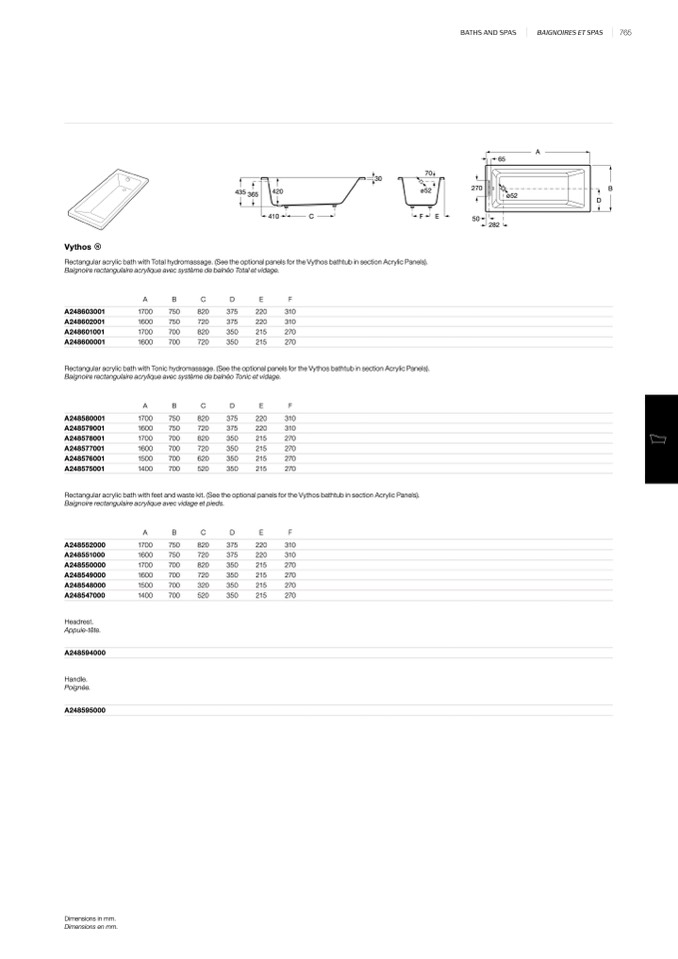 Rectangular acrylic bath with feet and waste kit. (See the optional panels for the Vythos bathtub in section Acrylic Panels).