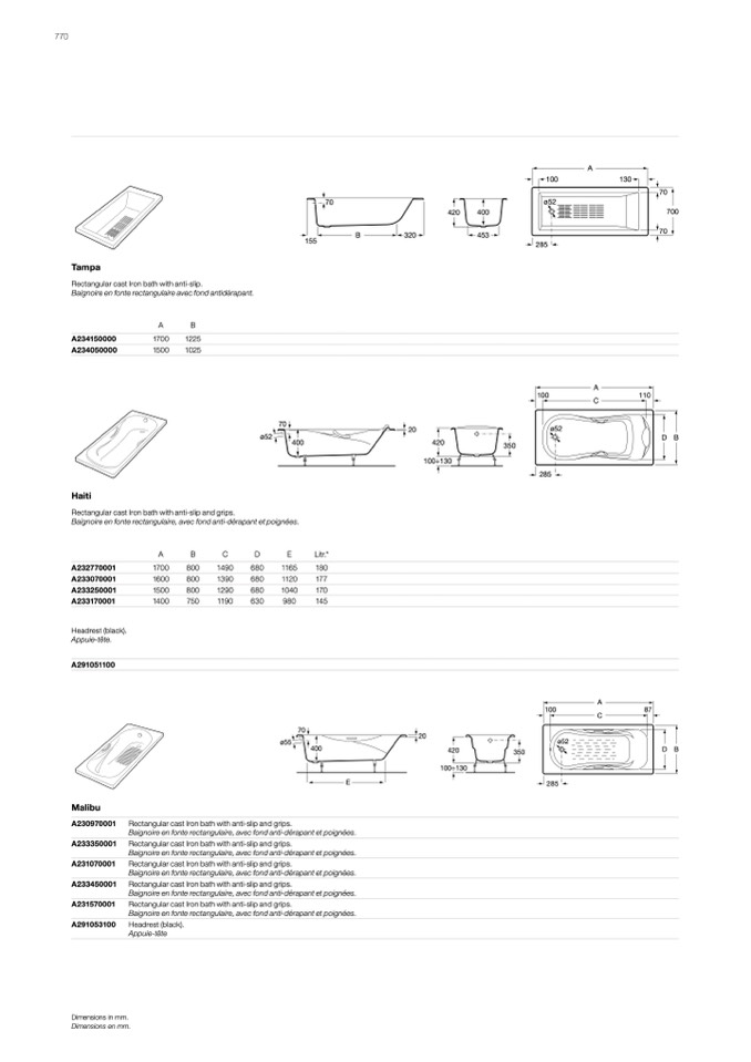 Rectangular cast Iron bath with anti-slip and grips.