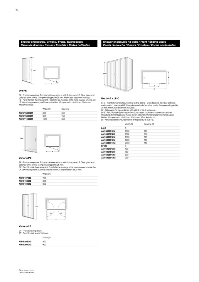 walls or with 1 side panel LF. Clear glass and polished silver profile. Compensating profile